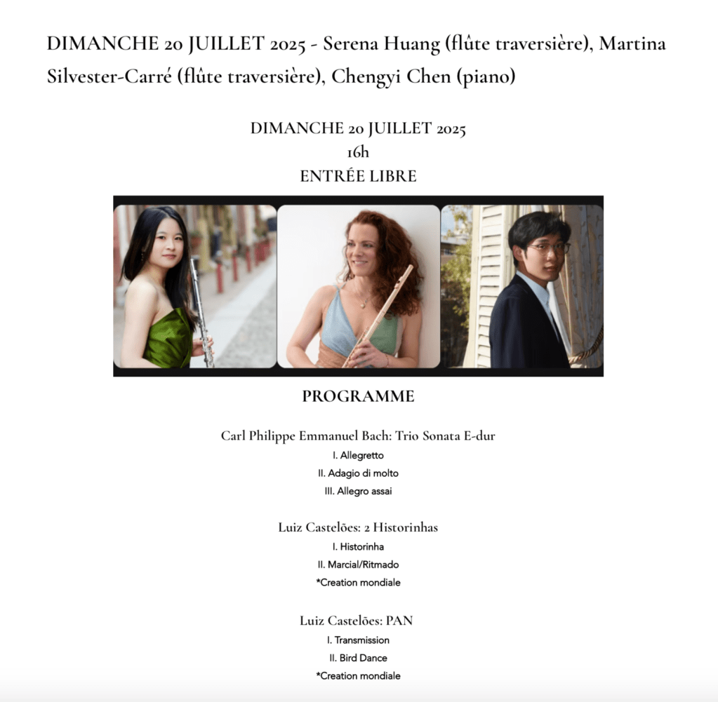[20] Estreia / Premiere: “…PAN!!!…” for flute duo (2025); Flutes: Serena Huang & Martina Silvester (Église Saint-Merry, Paris, France); link: https://www.paroissesaintmerry.fr/post/dimanche-20-juillet-2025-serena-huang-fl%C3%BBte-traversi%C3%A8re-martina-silvester-carr%C3%A9-fl%C3%BBte-traversi